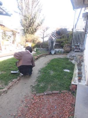 以前からレンガを敷きたがっていたT嬢と、ガーデニング志望?でバイトに入ったI君。